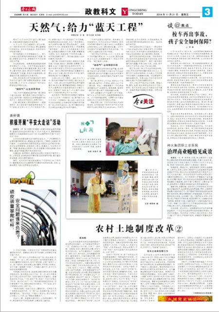 11月11日、11月21日,《河南青年報》、《今日永城》分別在重要位置以《中裕燃氣:讓永城的藍天更藍》、《天然氣:給力‘藍天工程’》為題,對永城公司為“藍天工程”作出的貢獻進行了深入報道,在廣大市民中引起了廣泛的關(guān)注。